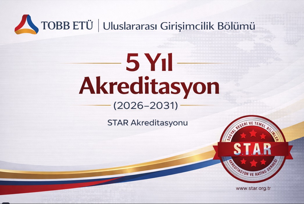 The undergraduate program of the Department of International Entrepreneurship at TOBB University of Economics and Technology (TOBB ETÜ) has been granted full accreditation for a period of five years, covering March 11, 2026 – March 11, 2031, following a comprehensive evaluation process.