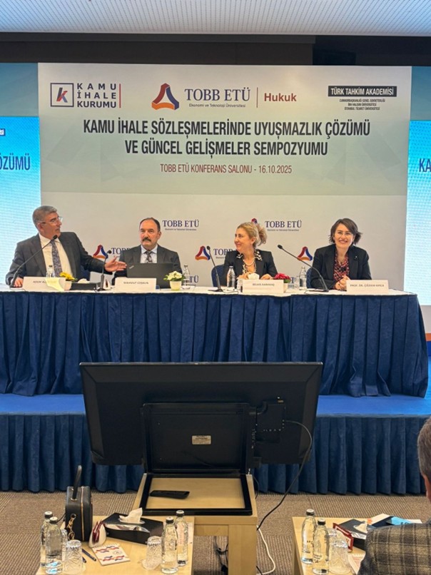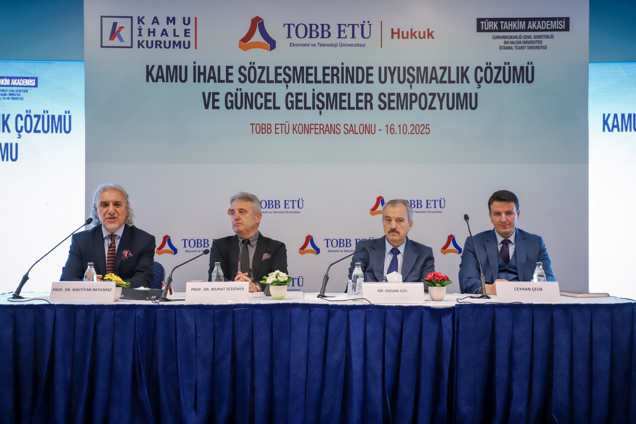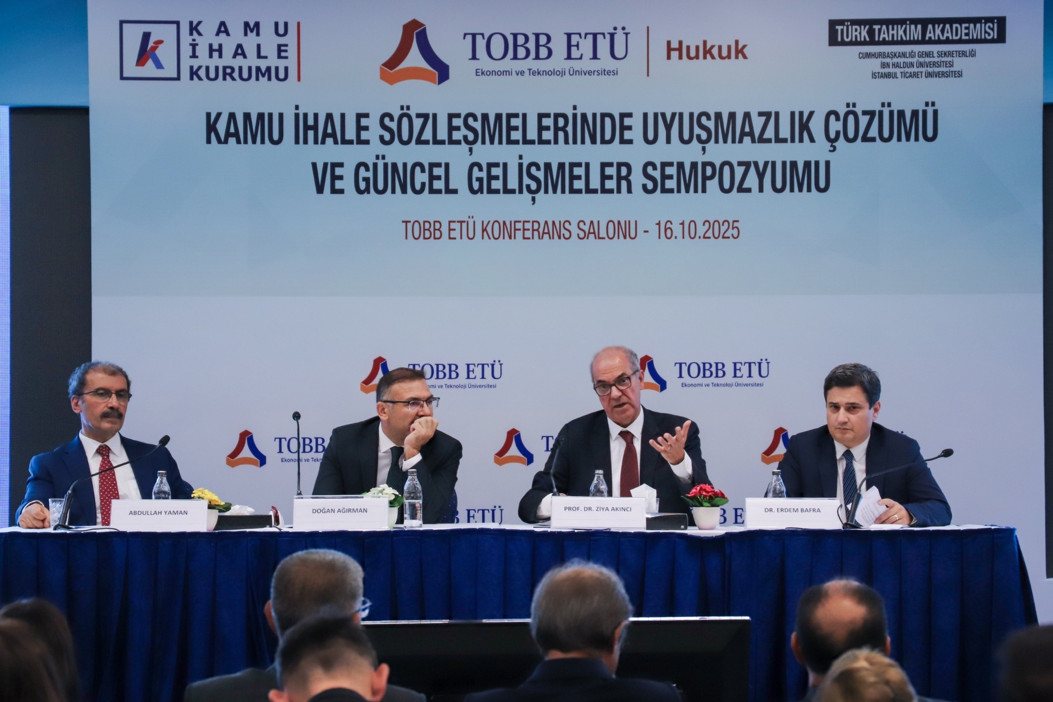 TOBB Ekonomi ve Teknoloji Üniversitesi Hukuk Fakültesi, Kamu İhale Kurumu ve Türk Tahkim Akademisi’nin ortaklaşa düzenlediği “Kamu İhale Sözleşmelerinde Uyuşmazlık Çözümü ve Güncel Gelişmeler Sempozyumu” etkinliği 16 Ekim 2025 tarihinde TOBB ETÜ Konferans Salonu’nda Yargıtay Hukuk Genel Kurulu başkanı, Yargıtay ve Danıştay daire başkanları ve üyeleri, Kamu İhale Kurumu başkanı, üyeleri ve uzmanları, Bölge Adliye Mahkemesi başkanları, Cumhurbaşkanlığı Hukuk İşleri Genel Müdürlüğünden uzmanlar ve daire başkanları, akademisyenler, tetkik hâkimleri, öğrenciler başta olmak üzere gerek kamu gerek özel sektördeki pek çok farklı kurum ve kuruluşta görev alan 600 civarındaki katılımcının iştiraki ve yoğun ilgisiyle gerçekleştirilmiştir. Cumhurbaşkanlığı Genel Sekreterliği Hukuk ve Mevzuat Müdürlüğü Daire Başkanı Doç. Dr. Eda Manav Özdemir, Kamu İhale Kurumu Başkanı Hamdi Güleç ve TOBB Ekonomi ve Teknoloji Üniversitesi Rektörü Prof. Dr. Yusuf Sarınay’ın açılış konuşmalarının ardından sempozyumun birinci oturuma geçilmiştir.