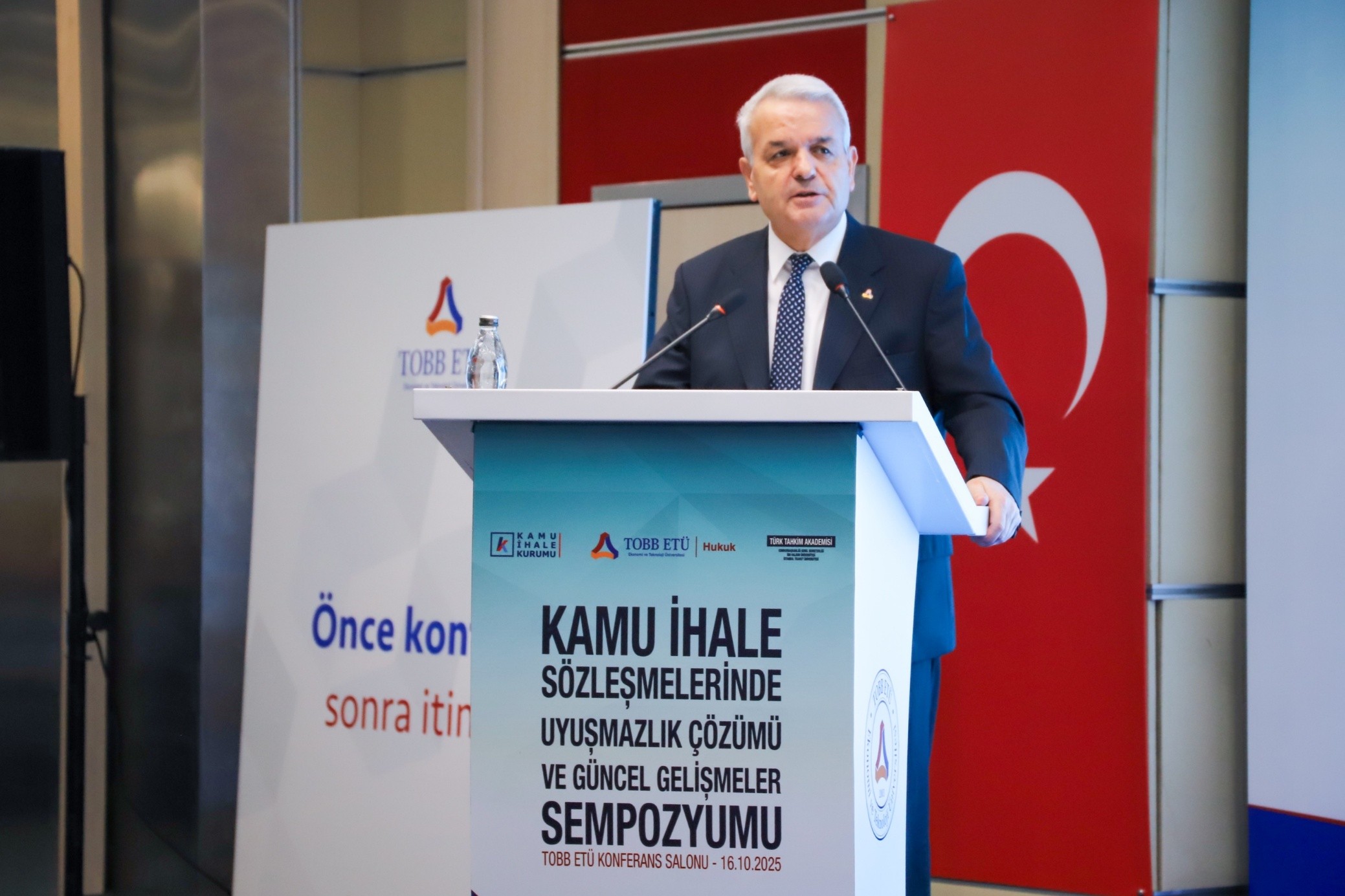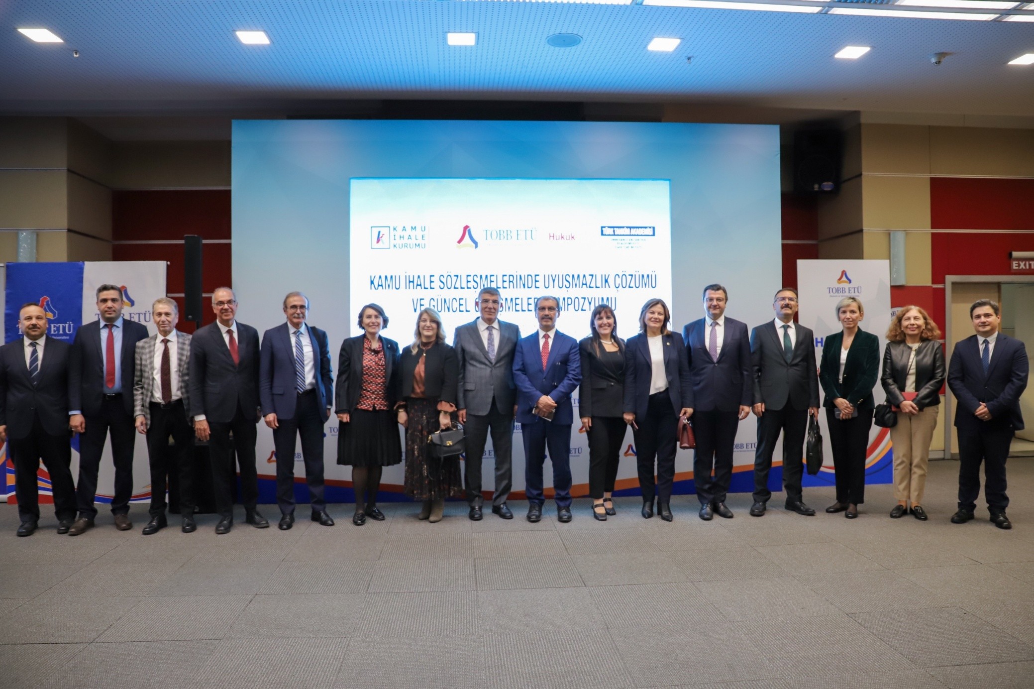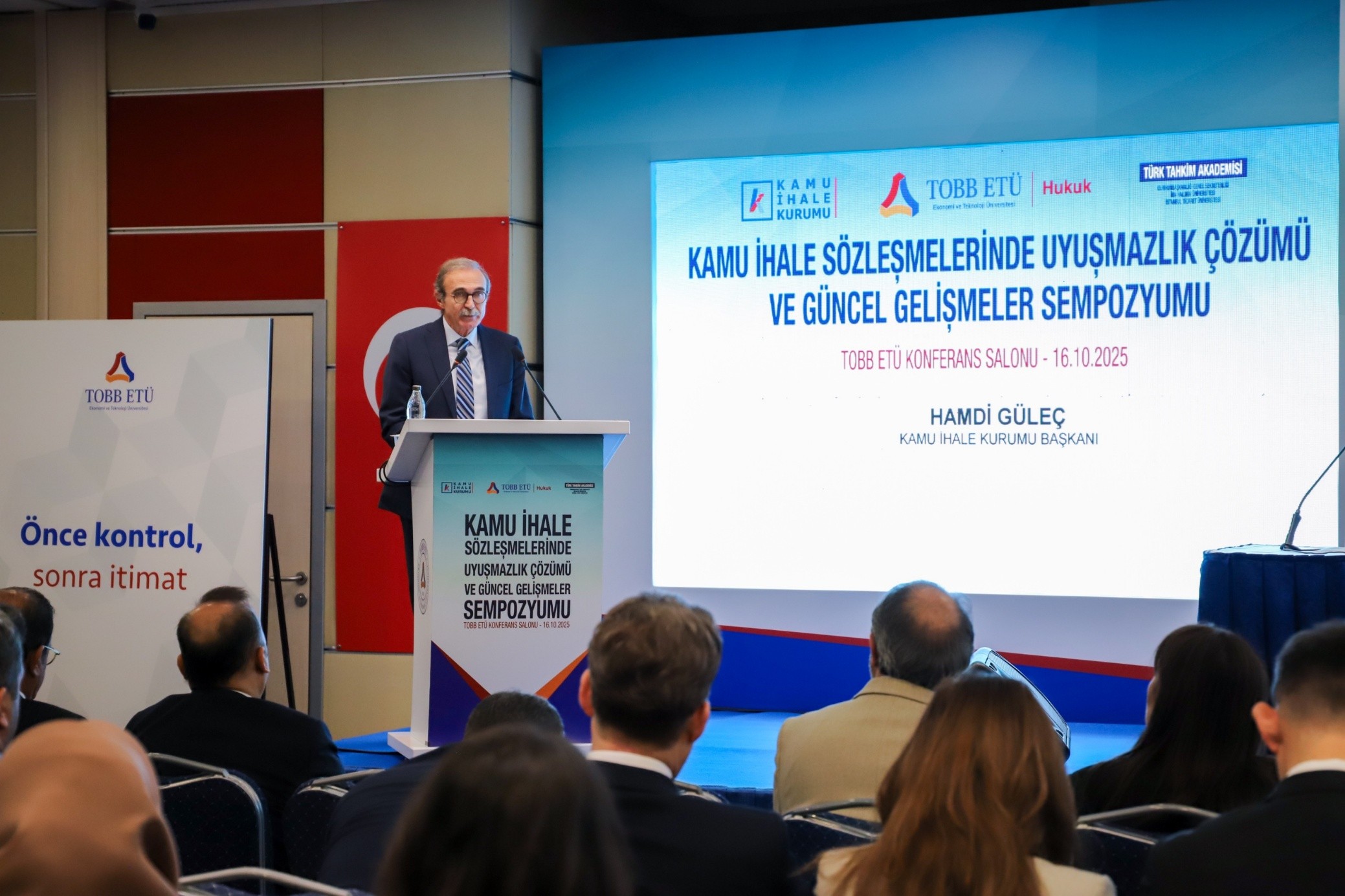TOBB Ekonomi ve Teknoloji Üniversitesi Hukuk Fakültesi, Kamu İhale Kurumu ve Türk Tahkim Akademisi’nin ortaklaşa düzenlediği “Kamu İhale Sözleşmelerinde Uyuşmazlık Çözümü ve Güncel Gelişmeler Sempozyumu” etkinliği 16 Ekim 2025 tarihinde TOBB ETÜ Konferans Salonu’nda Yargıtay Hukuk Genel Kurulu başkanı, Yargıtay ve Danıştay daire başkanları ve üyeleri, Kamu İhale Kurumu başkanı, üyeleri ve uzmanları, Bölge Adliye Mahkemesi başkanları, Cumhurbaşkanlığı Hukuk İşleri Genel Müdürlüğünden uzmanlar ve daire başkanları, akademisyenler, tetkik hâkimleri, öğrenciler başta olmak üzere gerek kamu gerek özel sektördeki pek çok farklı kurum ve kuruluşta görev alan 600 civarındaki katılımcının iştiraki ve yoğun ilgisiyle gerçekleştirilmiştir. Cumhurbaşkanlığı Genel Sekreterliği Hukuk ve Mevzuat Müdürlüğü Daire Başkanı Doç. Dr. Eda Manav Özdemir, Kamu İhale Kurumu Başkanı Hamdi Güleç ve TOBB Ekonomi ve Teknoloji Üniversitesi Rektörü Prof. Dr. Yusuf Sarınay’ın açılış konuşmalarının ardından sempozyumun birinci oturuma geçilmiştir.