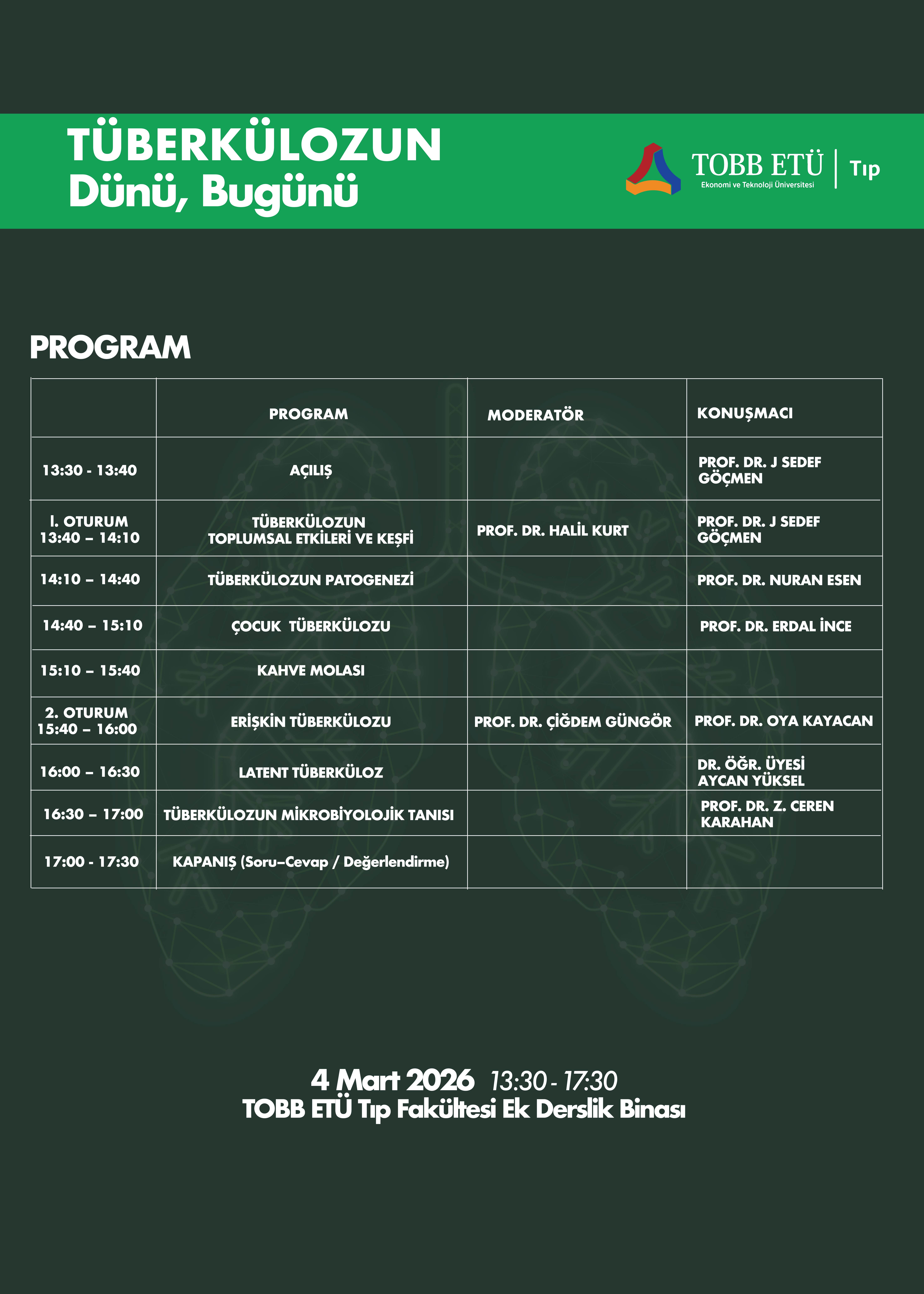 TOBB ETÜ Tıp Fakültesi tarafından düzenlenen “Tüberkülozun Dünü, Bugünü” başlıklı bilimsel toplantı, tüberkülozun tarihsel gelişiminden güncel tanı ve tedavi yaklaşımlarına kadar geniş bir perspektif sunmayı amaçlamaktadır.