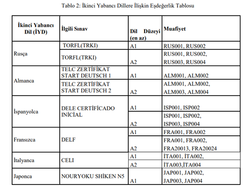 b.Uluslararası yabancı dil sınavları ile muafiyet verilebilir. Öğrenciler tercih etmiş oldukları ikinci yabancı dile ait aşağıdaki tabloda yer alan İYD derslerinden yine aynı tabloda belirtilen uluslararası sınavlarla muafiyet elde edebilirler.