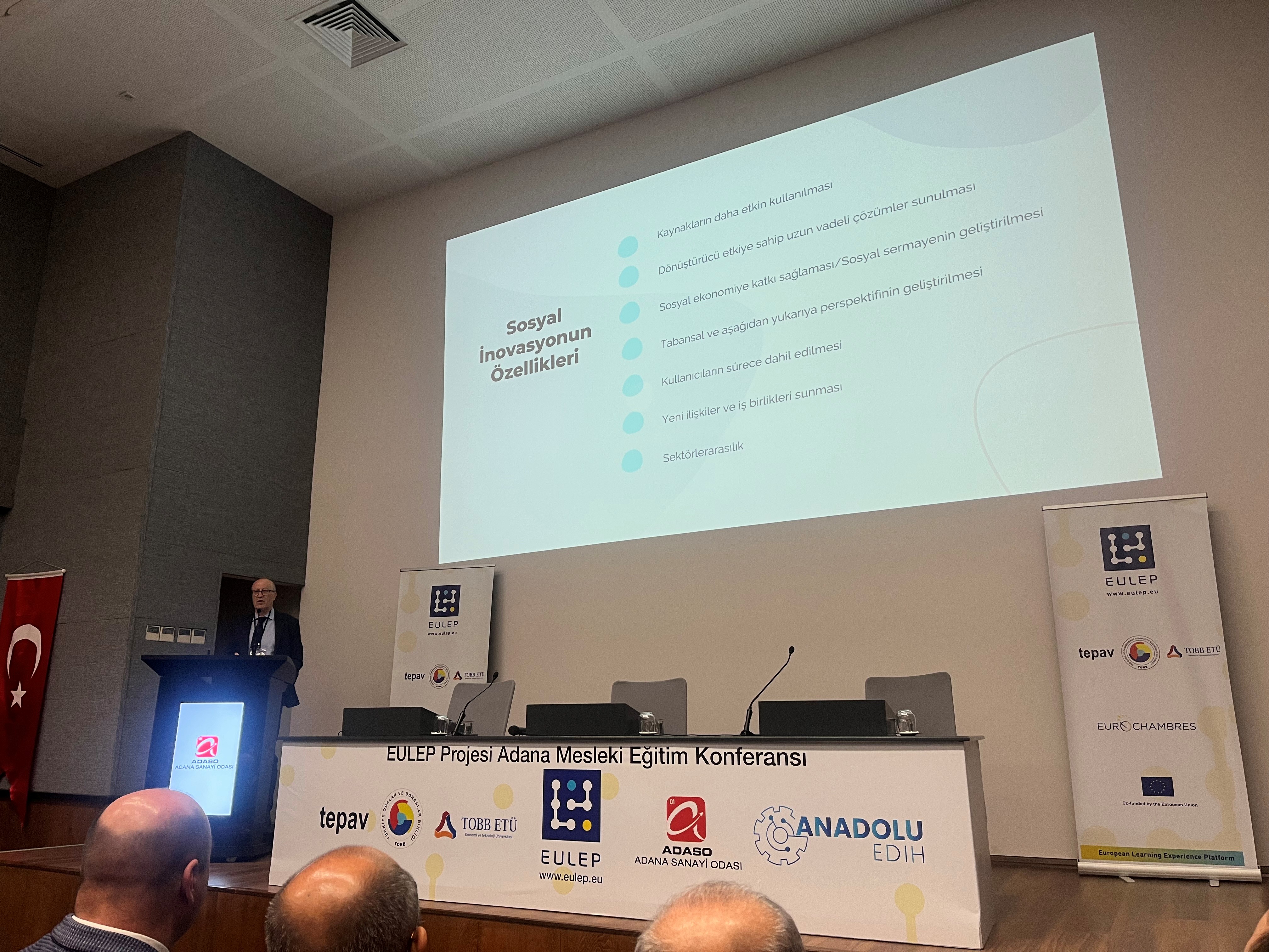 TOBB ETÜ, TOBB ve TEPAV’ın proje ortağı olduğu, Adana Sanayi Odası olarak ise iştirakçisi bulunduğu EULEP – European Learning Experience Platform Projesi kapsamında düzenlediğimiz Adana Mesleki Eğitim Konferansı, mesleki eğitimde farkındalığı artıran ve işletmelerin yeşil- dijital dönüşümüne katkı sağlayan önemli bir buluşma oldu. Toplantıda EULEP hakkında kapsamlı bilgiler verilirken, toplantıya Adana Sanayi Odası temsilcileri, bölgedeki sanayi kuruluşlarının yöneticileri, eğitim kurumları yetkilileri, meslek okullarında eğitim gören öğrenciler ve paydaşlar yoğun ilgi gösterdi.