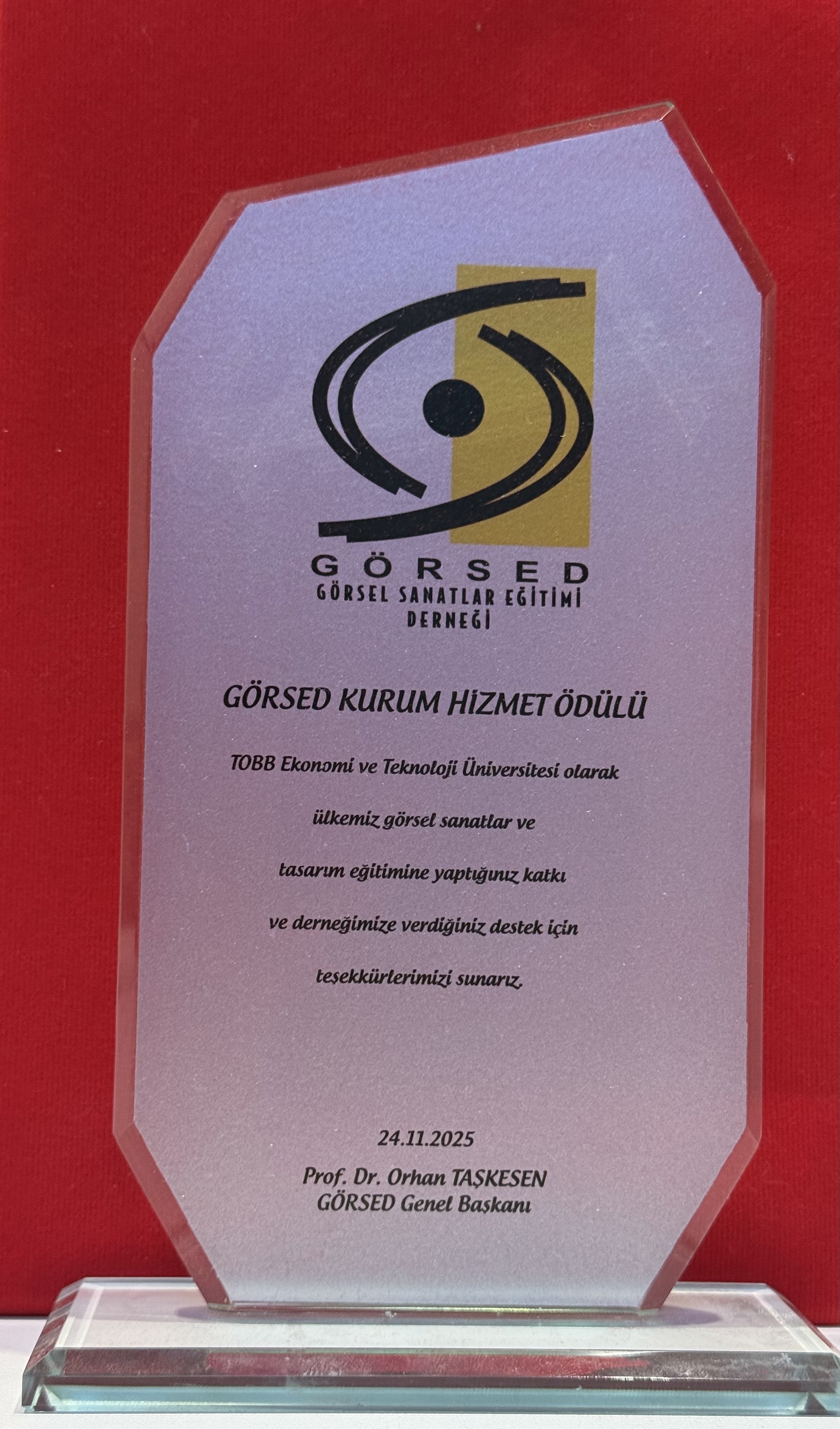 Erzincan Binali Yıldırım Üniversitesi ile Görsel Sanatlar Eğitimi Derneği (GÖRSED) tarafından ortaklaşa düzenlenen 24 Kasım kutlamaları kapsamında verilen GÖRSED Kurum Hizmet Ödülüne bu yıl üniversitemiz layık görülmüştür. TOBB ETÜ olarak gerek sanat ve tasarım eğitimine yaptığımız katkı gerekse GÖRSED etkinliklerine desteğimiz ve ev sahipliğimizden dolayı verilen kurum hizmet ödülünü Rektörümüz adına Genel Sekreterimiz Prof. Dr. Olgun Değirmenci’ye EBYÜ Rektörü adına Eğitim Fakültesi Dekanı Prof. Dr. Fethi Kayalar sunmuştur.
