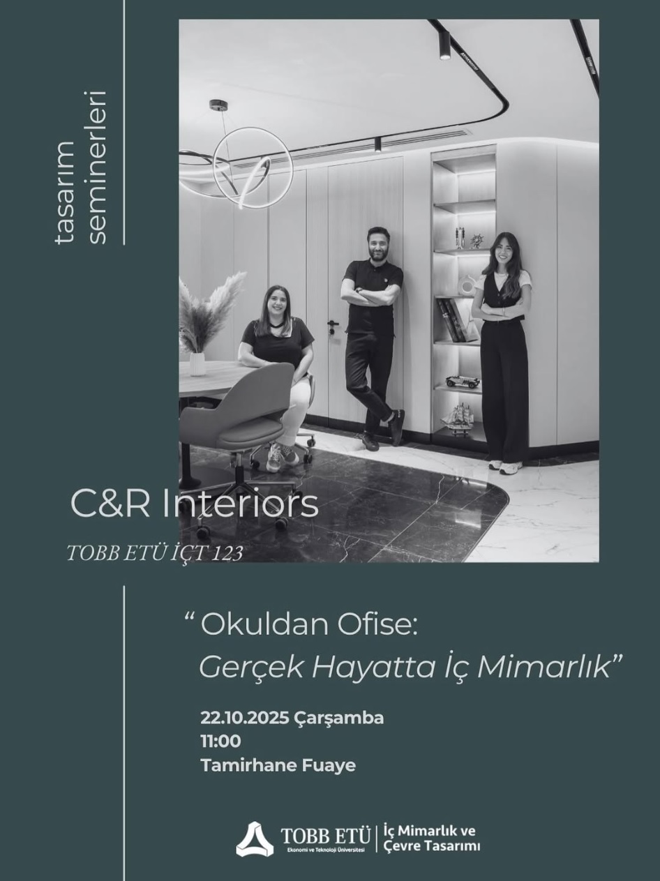 Birincisi 23 Ekim 2025 Perşembe günü düzenlenen etkinliğin konuğu C&R Interiors olmuştur. Seminere, C&R İç mimarlığın ortaklarından ve bölümümüz mezunu Çisem Birkan ile İlkiz Atar konuk olmuştur. “Okuldan Ofise: Gerçek Hayatta İç Mimarlık” başlığı ile derinleşen seminer dizisinin ilk ayağı gerçek piyasa deneyimleri üzerinden şekillenmiştir. Konuklarımıza, öğrencilerimize ve bize kattıkları değerli bilgiler için teşekkürlerimizi sunuyoruz.