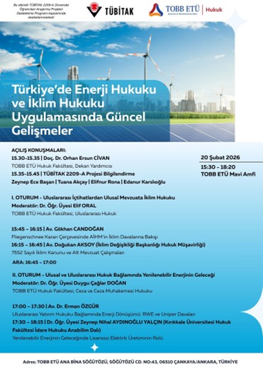 Açılış konuşmasını TOBB ETÜ Hukuk Fakültesi Dekan Yardımcısı Doç. Dr. Orhan Ersun Civan yaptığı ve iki oturum şeklinde kurgulanan seminerin ilk bölümünde, Dr. Öğr. Üyesi Elif Oral moderatörlüğünde, Av. Gökhan Candoğan AİHM’in iklim davalarına yönelik güncel içtihatlarını “Fliegenschnee Kararı” çerçevesinde analiz etmiş; İklim Değişikliği Başkanlığı Hukuk Müşaviri Av. Doğukan Aksoy ise 7552 Sayılı İklim Kanunu ve beraberindeki alt mevzuat hazırlıklarına dair güncel hukuki çerçeveyi aktarmıştır.
