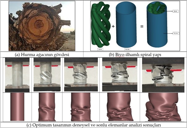 In this project, the energy absorption performance of a bio-inspired hybrid energy absorber profile was investigated both experimentally and numerically. Inspired by the cross-sectional structure of a palm tree trunk, spiral inserts were placed inside a hollow aluminum tube to create the bio-inspired hybrid energy absorber. Spiral components and tensile test specimens were manufactured using metal-based additive manufacturing methods.