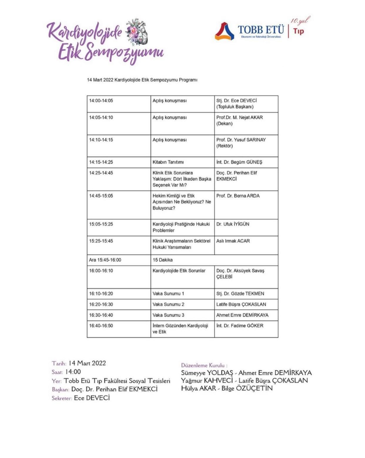 TOBB ETÜ Tıp Fakültesinde 14 Mart Tıp bayramı kutlamaları kapsamında Kardiyolojide Etik Sempozyumu düzenlendi. TOBB ETÜ Uluslararası Biyoetik Topluluğu tarafından düzenlenen sempozyumda Doç. Dr. P. Elif Ekmekçi, Prof. Dr Berna Arda, Doç. Dr. Aksüyek Savaş Çelebi ve Dr. Ufuk İyigün konuşmacı olarak yer aldı. Öğrencilerimizden Int. Dr. Begüm Güneş, Stj. Dr. Gözde Tekmen, Latife Büşra Çokaslan, Ahment Emre Demirkay, Int Dr. Fadime Göker ve Stj. Dr. Ece Deveci’de vaka sunumları ile sempozyumda yer aldılar.