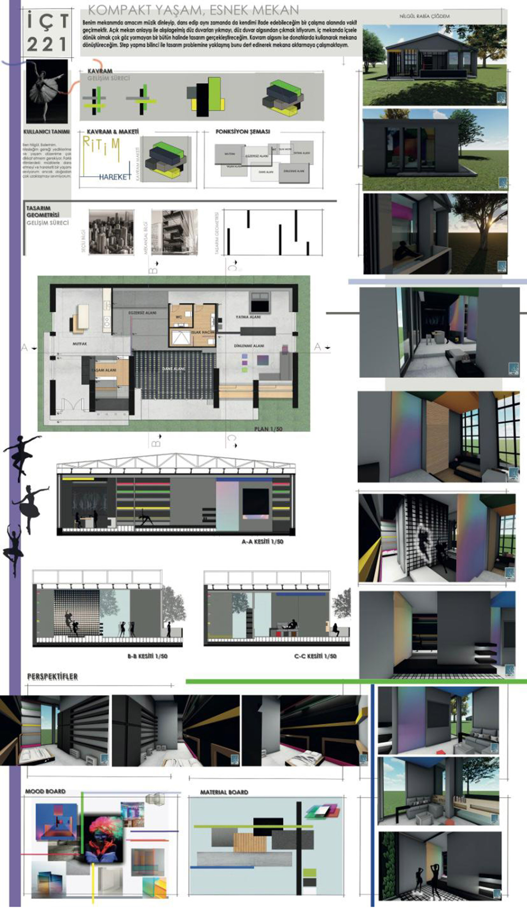 Öğrencilerimizin ilk mekan tasarım stüdyosu olan İÇT221’in beklentisi; günümüz koşullarına uygun bir ‘kompakt yaşam mekânı’ tasarlanması oldu. Stüdyo günümüz “MEKÂN” anlayışında aranan en temel koşul nedir? sorusundan yola çıktı. Bu sorunun cevabı; eğitim, spor, çalışma, müzik vb. sosyal hayatımızdaki tüm eylemlerinin bütünleşik bir yapıya dönüşmesi ve bir tek yaşam mekanının içinde çoklu fonksiyon gerçekleştirme gereksiniminin karşılanması olarak verildi. Proje kapsamında beklenen, bu yeni izole yaşam biçimi ve pratiğinden ortaya çıkan kompakt (bir arada) ihtiyaç ve gereksinimlerin çözümlendiği esnek mekân önerisi(lerinin) getirilmesi oldu.