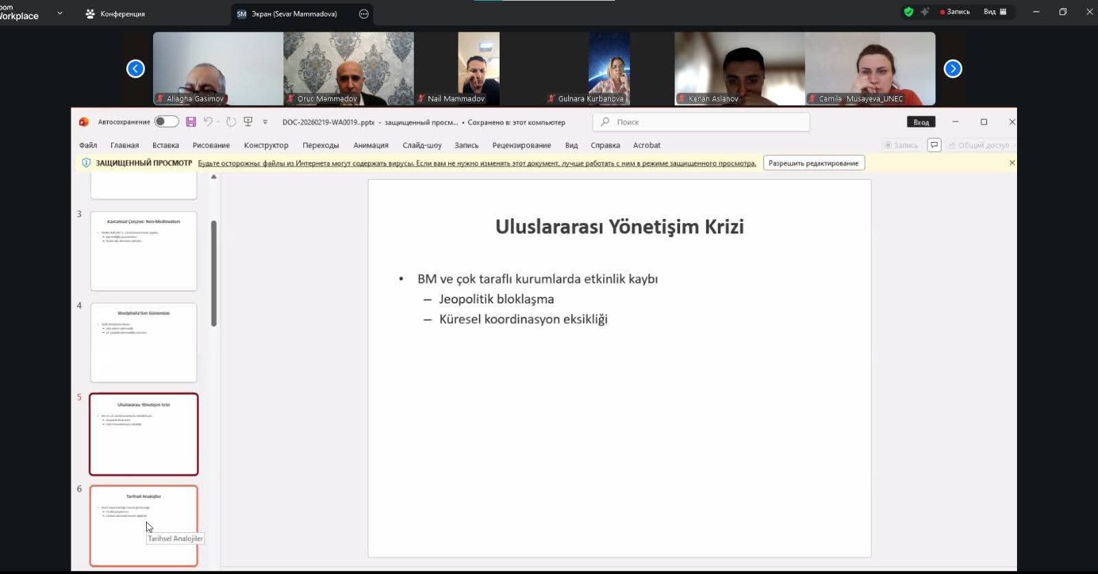 Geçtiğimiz hafta Cuma günü, 20 Şubat 2026 tarihinde, çevrimiçi olarak Azerbaycan’ın en önemli yükseköğretim kurumlarından biri olan Bakü’deki Azerbaycan Devlet İktisat Üniversitesi (UNEC https://unec.edu.az/en/ ) bünyesinde, “İşletme Yönetimi” Anabilim Dalı’nın “Güncel Konu” serisi kapsamında Ali Oğuz Diriöz hocamız bir sunum yapma imkânı buldu.