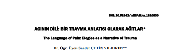 TOBB ETÜ Türk Dili ve Edebiyatı bölüm başkan yardımcısı Dr. Öğr. Üyesi Saadet Çetin Yıldırım’ın “Acının Dili: Bir Travma Anlatısı Olarak Ağıtlar” başlıklı makalesi, uluslararası AHCI indeksli Milli Folklor dergisinin 148. Sayısında (Kış, 2025) yayımlandı. Çalışmada, Türk edebiyatındaki bireysel ve toplumsal kayıpları konu edinen ağıtlar, travma anlatısı teorisi çerçevesinde incelenmiş, travmatik deneyimlerin ifade edilmesinde ağıtların son derece etkili olduğu sonucuna varılmıştır. Travmaların edebi dile yansıtılarak görünür kılınması ve geleceğe aktarılması bakımından, ağıtların bu teori ile incelenmeye elverişli olduğu ortaya konulmuştur.