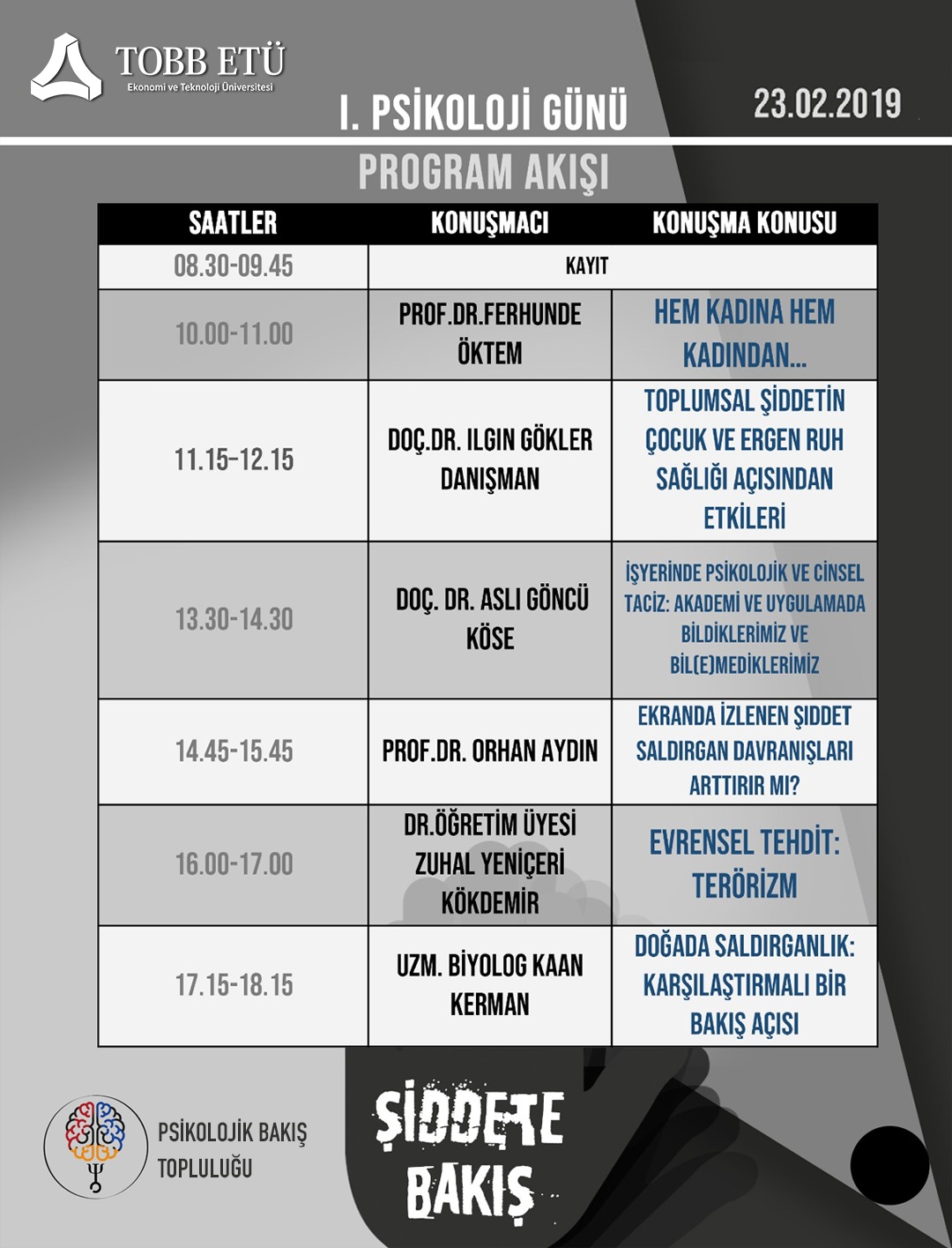 Psikolojik Bakış Topluluğu tarafından düzenlenen 1. TOBB ETÜ Psikoloji Günü 23 Şubat 2019 Cumartesi günü 500 kişilik bir katılımla gerçekleşti. Psikoloji günü kapsamında çeşitli üniversitelerden alanında uzman hocalarımızın sunumları katılımcılar tarafından büyük ilgi gördü.