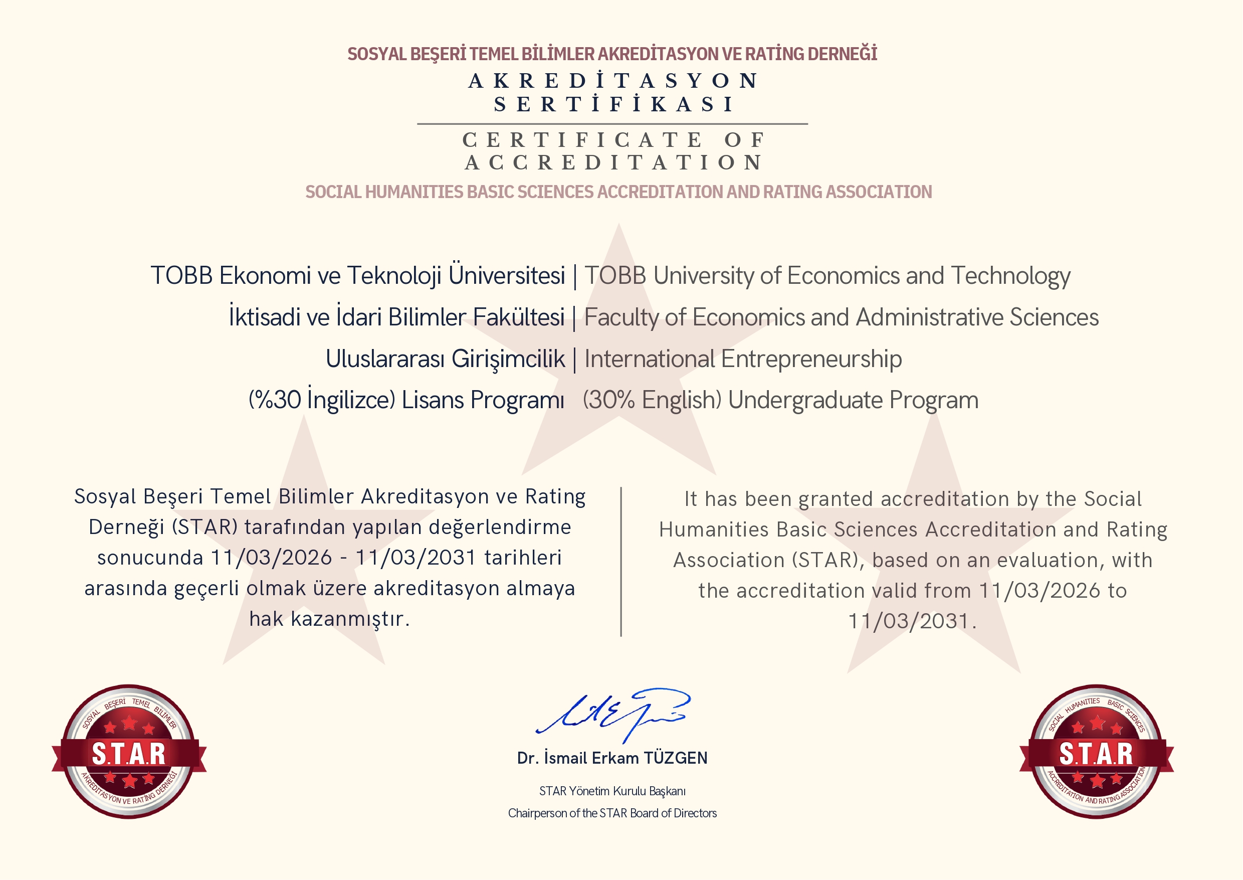 TOBB ETÜ Uluslararası Girişimcilik Bölümü lisans programı, yürütülen kapsamlı değerlendirme süreci sonucunda 11 Mart 2026 – 11 Mart 2031 dönemini kapsayacak şekilde 5 yıl süreyle tam akreditasyon almaya hak kazanmıştır.
